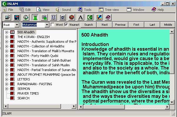 Islam learning tool software for Windows 9x/NT. With the Islam software you can read all you need to knew about Islam religion. Program featured: The Qur'an recitation in mp3 sound format, The Qur'an translations on 11-22 languages, Islam history and other databases, various Hadiths - about life of the prophet Muhammad (peace be upon him) praying animations with which you can learn how to pray, search engine, opening and saving searched text data, calculating praying times tool, Creating HTML pages of one or all Islam databases. Islam is beautifull and Freee for use software.